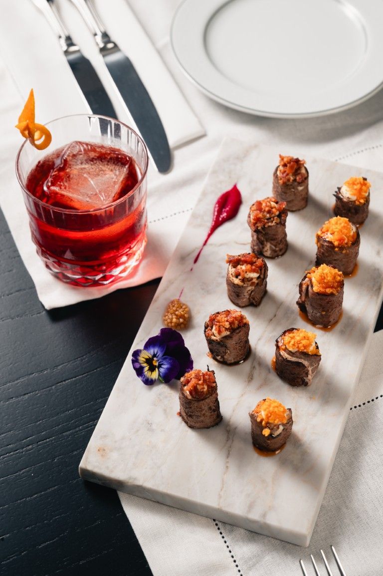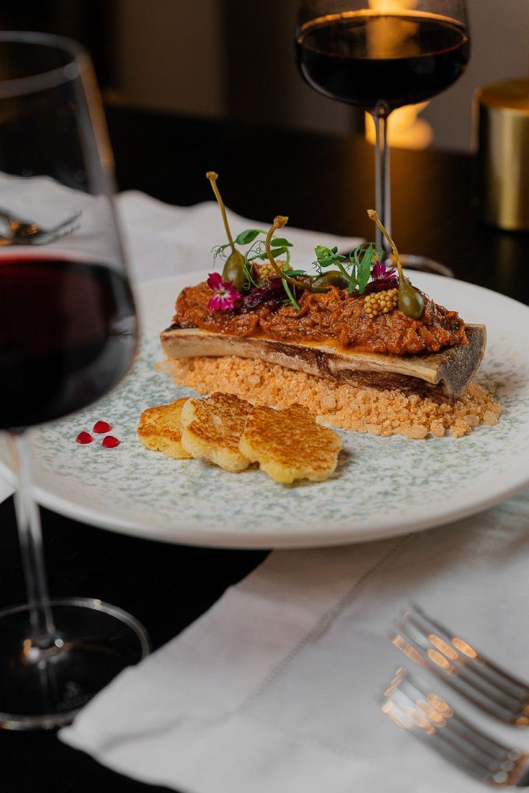 Tutano assado com ragú de filé mignon cozido na cerveja bock em baixa temperatura, alcaparrones e picles de cebola roxa